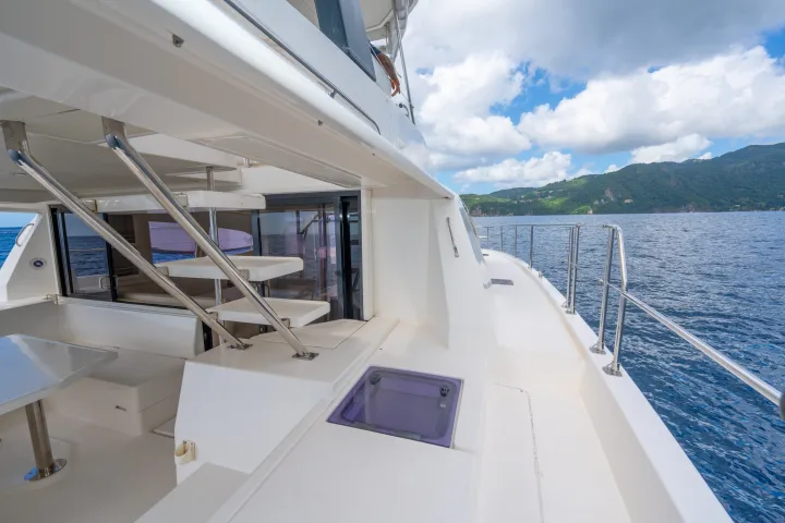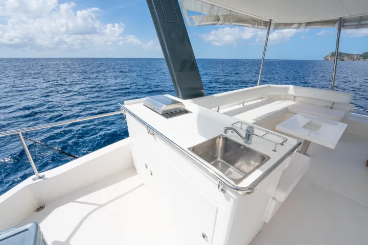 Enjoy a 360 degree view from the flybridge of this luxury Leopard 43 Power Catamaran, amazing sightlines from the saloon and the aft cockpit. The three cabin layout has an impressive space with a separate head/shower in each hull for cruising convenience. The three graciously sized beds accommodate six guests. A forward-opening door delivers easy access to the solid foredeck and provides cooling breezes and excellent ventilation throughout the catamaran.